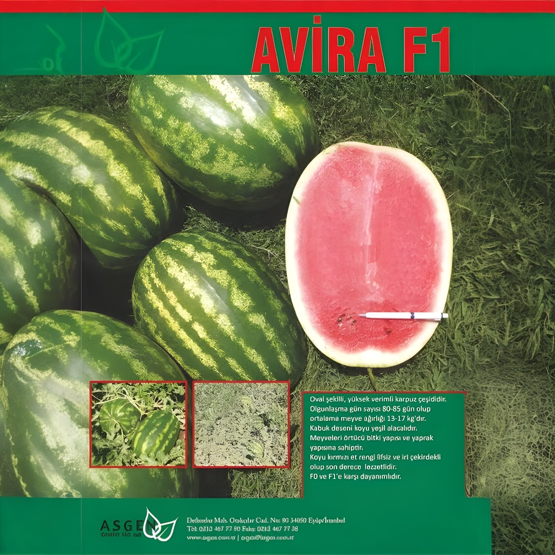 Avira F1, oval meyve yapısı ve yüksek verim potansiyeliyle öne çıkan hibrit bir karpuz çeşididir. Güçlü ve örtücü bitki yapısı sayesinde meyvelerini güneş yanıklığına karşı korur ve dengeli gelişim sağlar.
