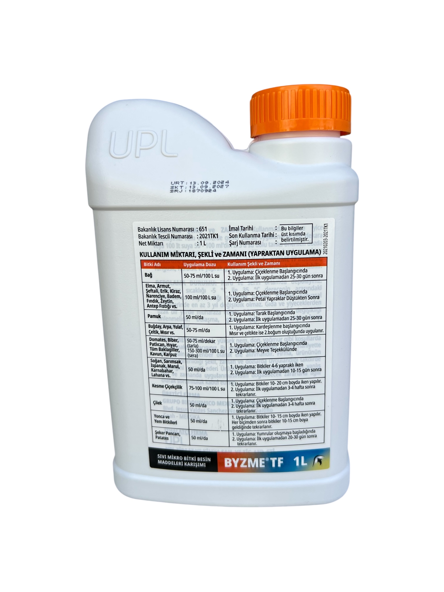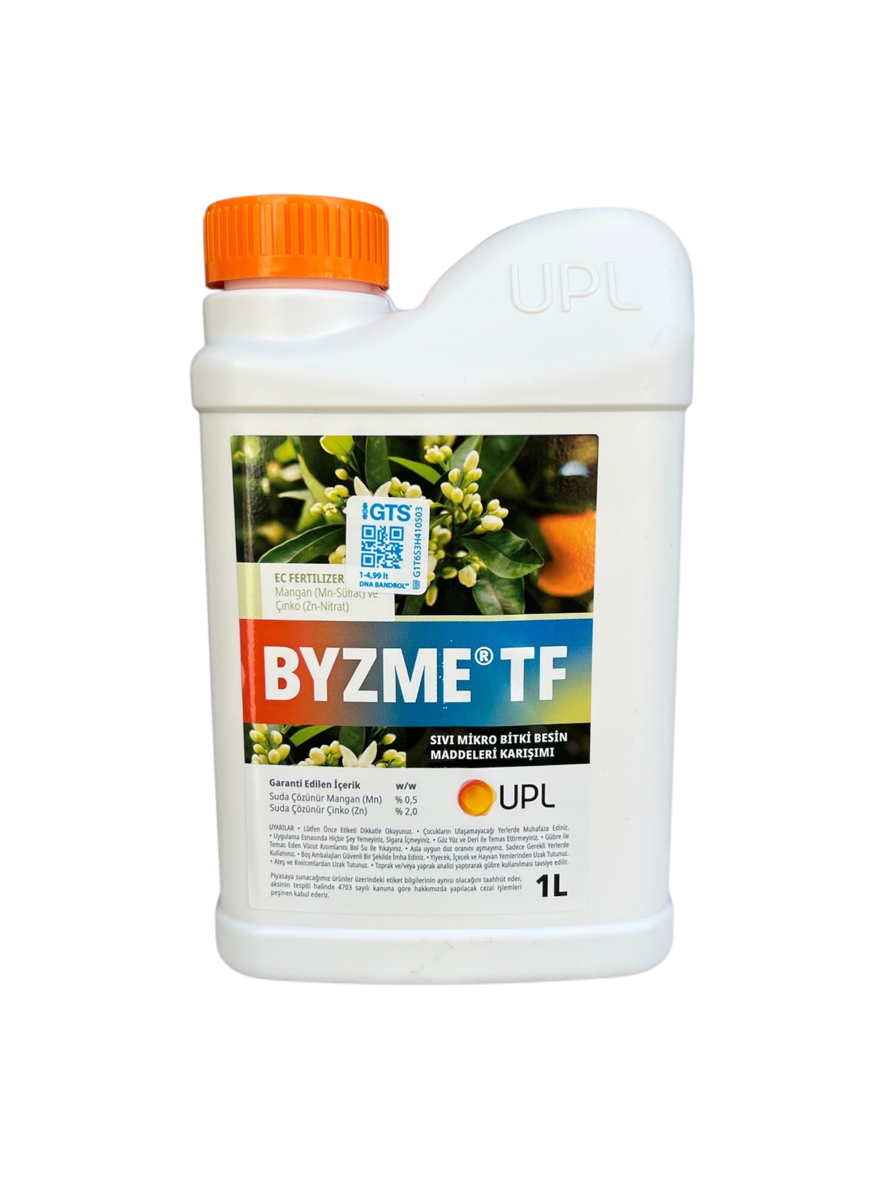 BYZME® TF; bitkilerde sık görülen mangan ve çinko eksikliklerini gidermeye yardımcı olan, yapraktan hızlı alım sağlayan sıvı mikro besin çözeltisidir. Yoğun gelişme, çiçeklenme ve meyve tutum dönemlerinde bitkinin metabolik faaliyetlerini destekler.